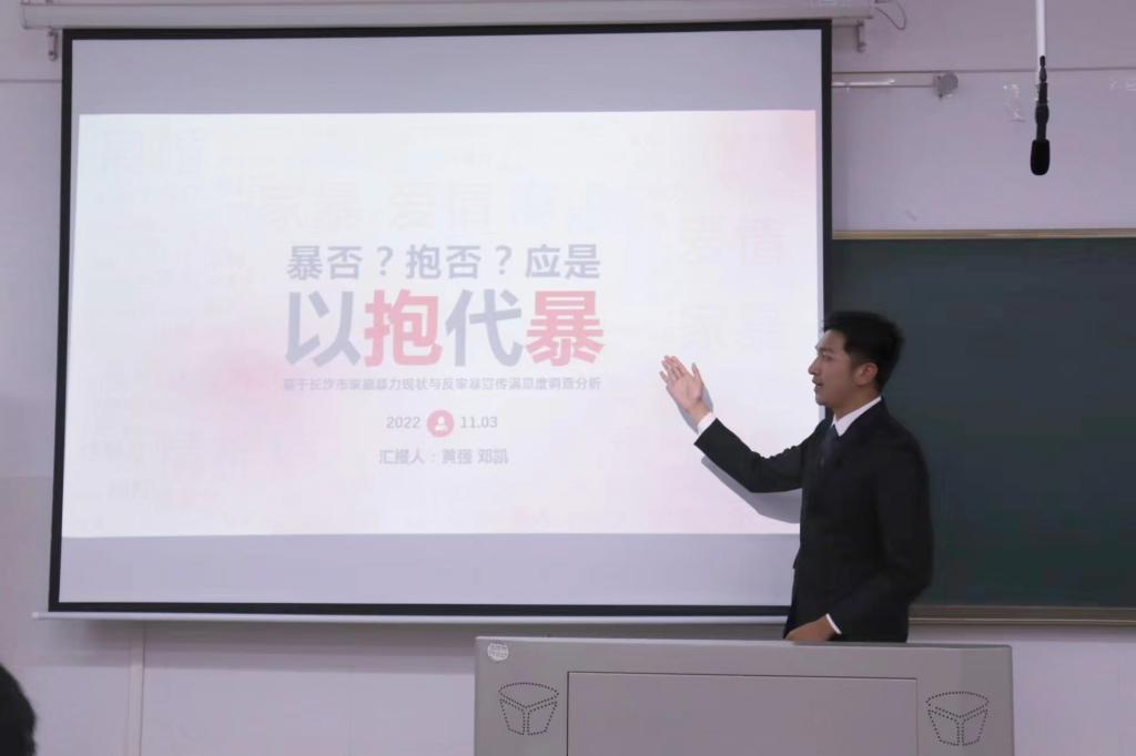 比赛开始,五个团队依次上台汇报参赛项目情况,并分别从项目介绍,项目背景,产品优势,市场分析,主要技术等方面进行阐述。其中,黄强队介绍的基于长沙市家庭暴力现状与反家暴宣传满意度的调查分析,意在帮助更多人摆脱家庭暴力。王瑞琦队介绍的个性辅学系统可以帮助学生更好的进行学习等。评委老师们根据五个团队的答辩进行了针对性的提问和点评,肯定了参赛队伍项目的应用场景的相对全面性,但也指出了算法欠缺、技术不足等方面的问题,并希望同学们能够提高专业能力,努力取得更好成绩。