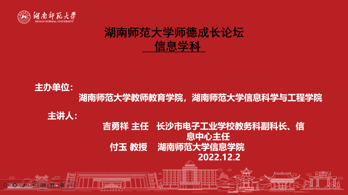(通讯员付玉,吴萱萱)2022年12月2日晚上19:30-21:30,太阳官网与教师教育学院在腾讯会议上成功举办了信息学科师德成长论坛。本次论坛邀请了我校示范性教育实践基地-------长沙市电子工业学校的教务科副科长、信息中心主任吉勇祥老师主讲,论坛主题为“信息学科教师的专业发展之路”。该论坛是师范专业必修课程《教师职业道德与专业发展》(信息学科)教学环节的最后一个部分,旨在从优秀的中学一线教师的角度,解读信息学科教师的职业道德与专业发展之路。本次论坛由教师教育学院和太阳集团tyc539联合举办,太阳集团tyc539付玉教授主持,计算机系副主任徐鹏飞出席会议,21级计科(高免)及21级计科(师范)全体学生共计87人参加了本次论坛。