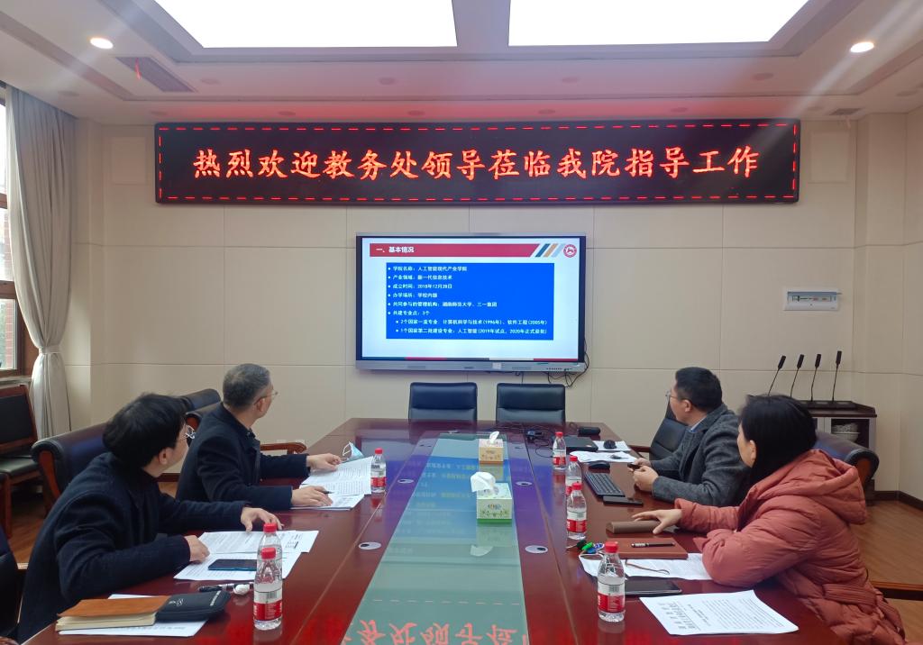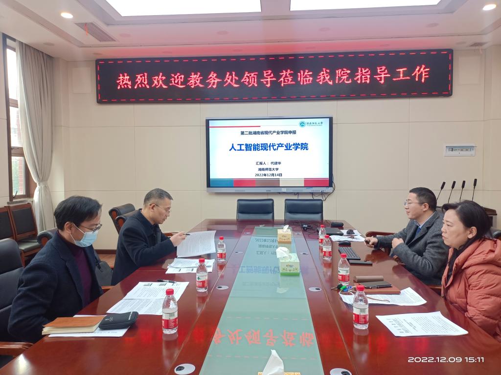 (通讯员 邓月明)2022年12月9日下午,教务处评建办常务副主任秦建新、实践教学管理科科长彭智辉一行莅临太阳集团tyc539指导2022年湖南省现代产业学院申报工作。太阳集团tyc539在院领导班子、实验中心老师等参加了此次会议。