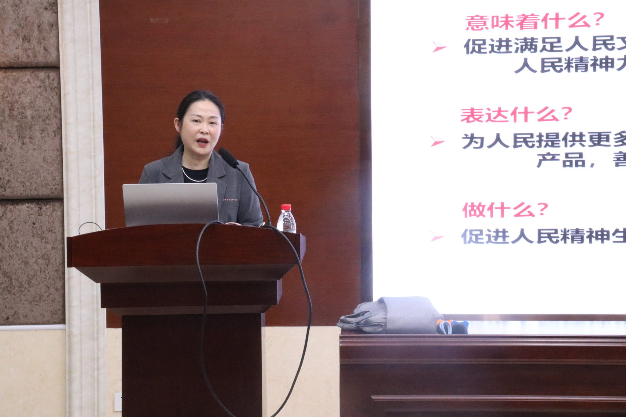 罗薇从“为什么”、“怎么做”两个方面,系统解说并展示了如何建设中国特色社会主义文化的道路,回答了如何以高度的文化自信铸就社会主义文化新辉煌的时代之问。大家深刻认识到建设具有强大凝聚力和引领力的社会主义意识形态、广泛践行社会主义核心价值观、用中国特色社会主义文化培根铸魂等的重要性。