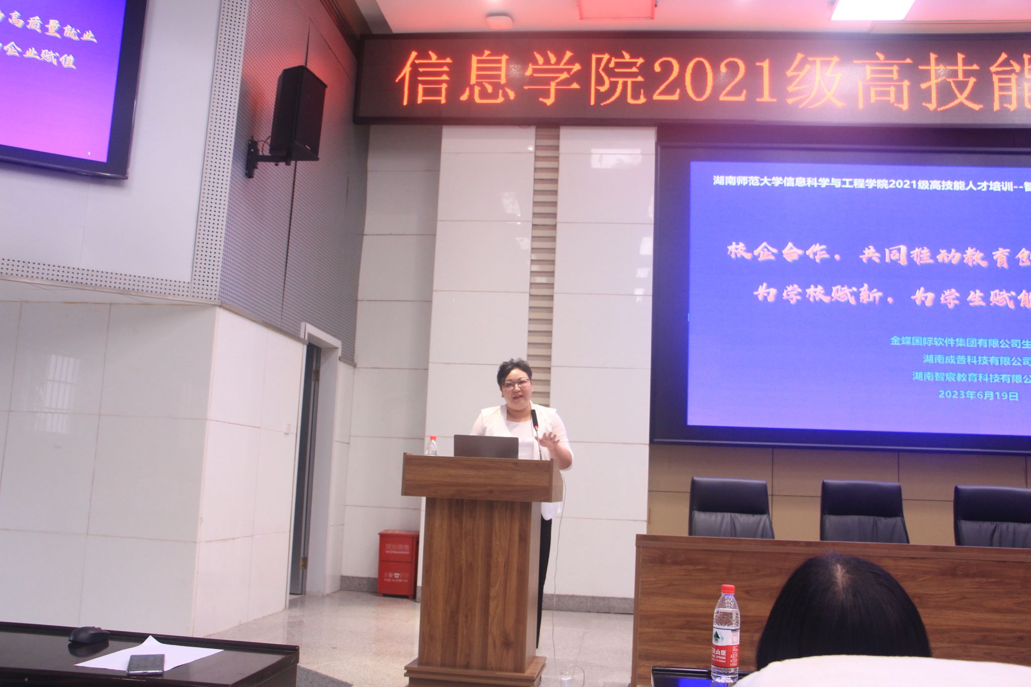 (通讯员 李玉胜)6月20日下午,太阳官网在至善楼学术讲堂举行2021级高技能人才特色培训班第三年实训动员大会。实训动员大会由学院副院长余小莉主持,长沙新华电脑学院教学办主任袁兵、湖南智宸教育科技有限公司董事长王芬,湖南大湘人力资源集团董事长王丹、培训讲师唐依等受邀参加。