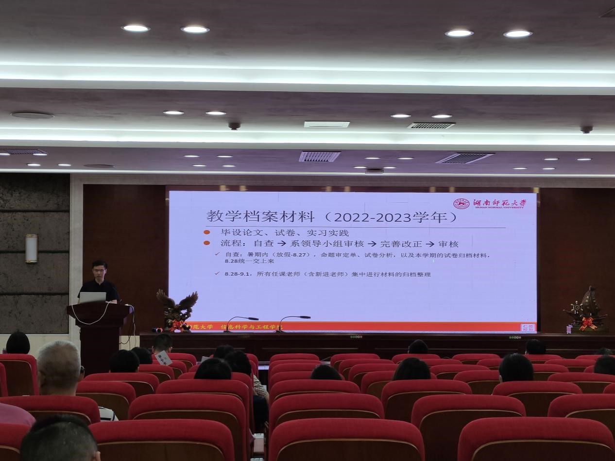 学院院长代建华首先为全体教职工主讲了《以中国式现代化全面推进中华民族伟大复兴》的专题党课,接着作了2023年上学期期末工作总结。他分别从本科教学工作、科研与学科建设工作、研究生就业工作、行政工作、社会服务创收工作、党建工作、师资建设以及工会活动等方面进行了全面回顾,并就实验室安全与管理工作、学院竞赛工作、党建工作等方面进行了详细介绍,同时对下半年的工作提出了具体规划和期望。学院教学副院长刘相滨对本科教学评估工作进行了详细布置,学院行政副院长余小莉对暑假及下学期开学工作进行了详细安排。